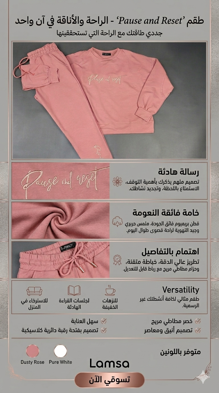 بفضل التصميم العملي للطقم، يمكن ارتداؤه في المنزل، أثناء التسوق أو حتى عند السفر. إنه خيار مثالي لكل من تبحث عن الجمع بين الأناقة والراحة، دون التنازل عن أي منهما.